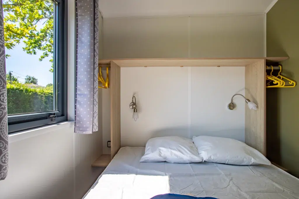 La nouvelle formule du Tithome (sans sanitaire, ni eau) propose un véritable retour à la nature avec son bardage en bois et son toit en palme. Ce mobile home cabane est équipé d’un séjour, d’une cuisine équipée et de 2 chambres (une chambre avec un lit en 140 et une 2ème chambre avec 3 lits simples).