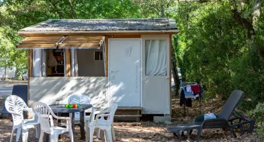 Petit mobile-home en toile et en dur (MHT), pour une intégration parfaite dans le paysage. Deux chambres, salon et kitchenette. Sans sanitaires.